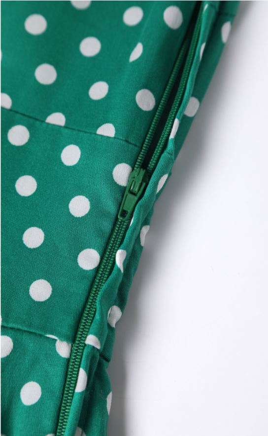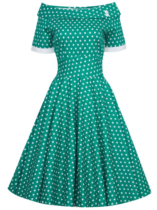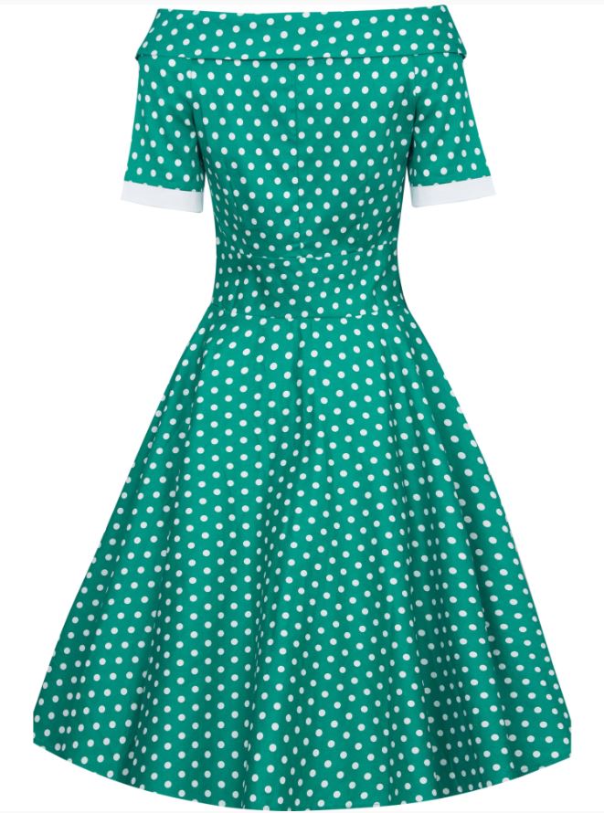 Darlene retro swingruha a Dolly&Dotty-tól, anyaga: 95% pamut, 5% elasztán. 50-es évek stílusát idéző ruha zöld-fehér pöttyös, rövid ujjú, kontrasztos szegélyekkel, vállra hajló nyakkivágás, oldalt rejtett cipzár.