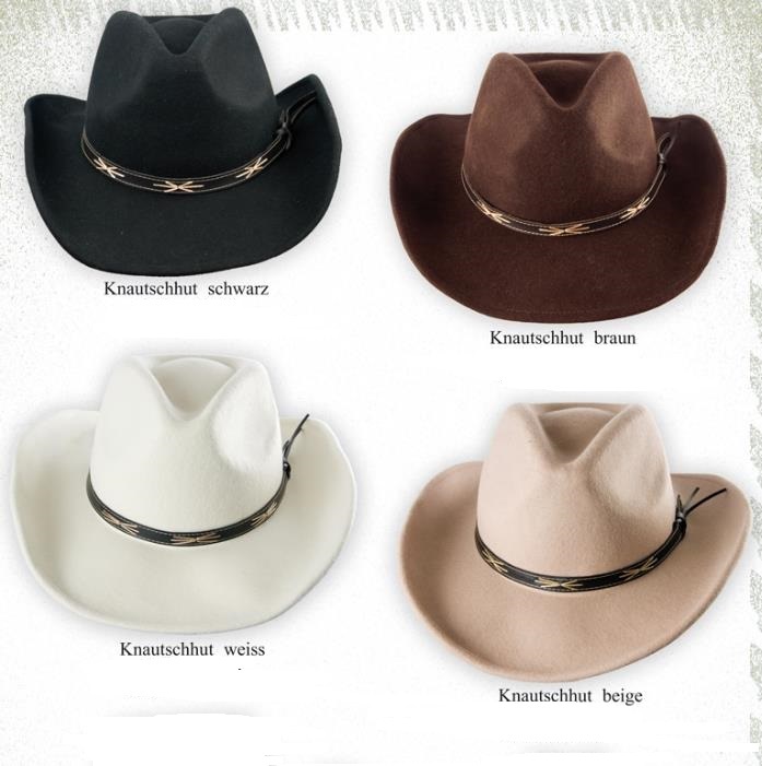 Gyapjúfilc westernkalap négy színben, bőr szalaggal.