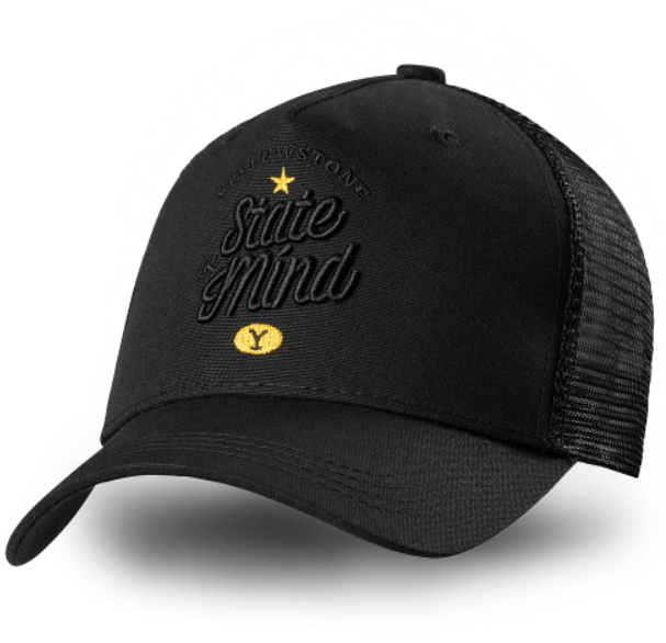 TC Yellowstone 03 – divatos kamionos jellegű baseball sapka, hátul  hálós rész, állítható patenttal, velúr hatású anyagból, elöl díszes 3D hímzéssel, fekete színben.