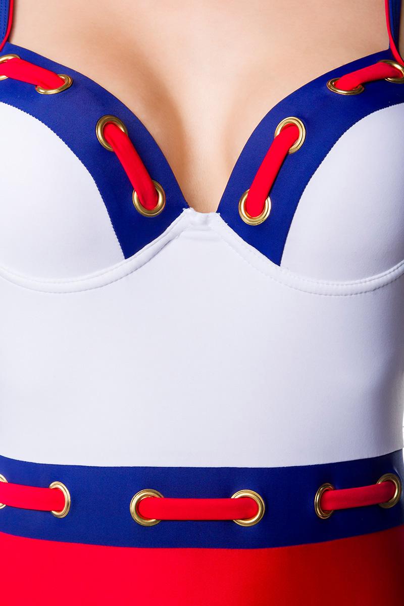 Tengerész retro fürdőruha állítható vállpántokkal. Anyaga: 82 % poliészter, 18 % elasztán.