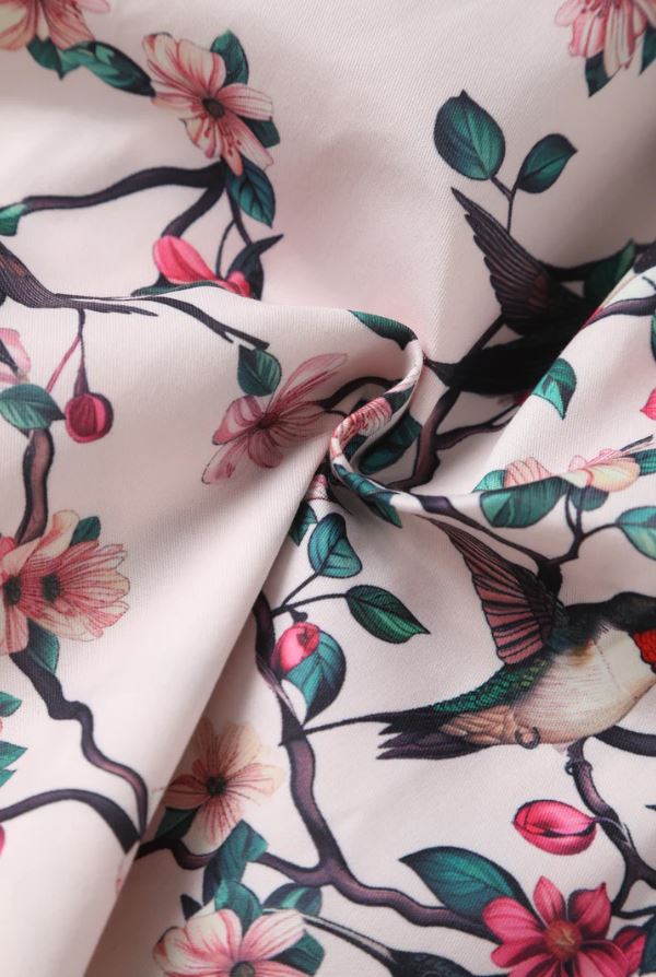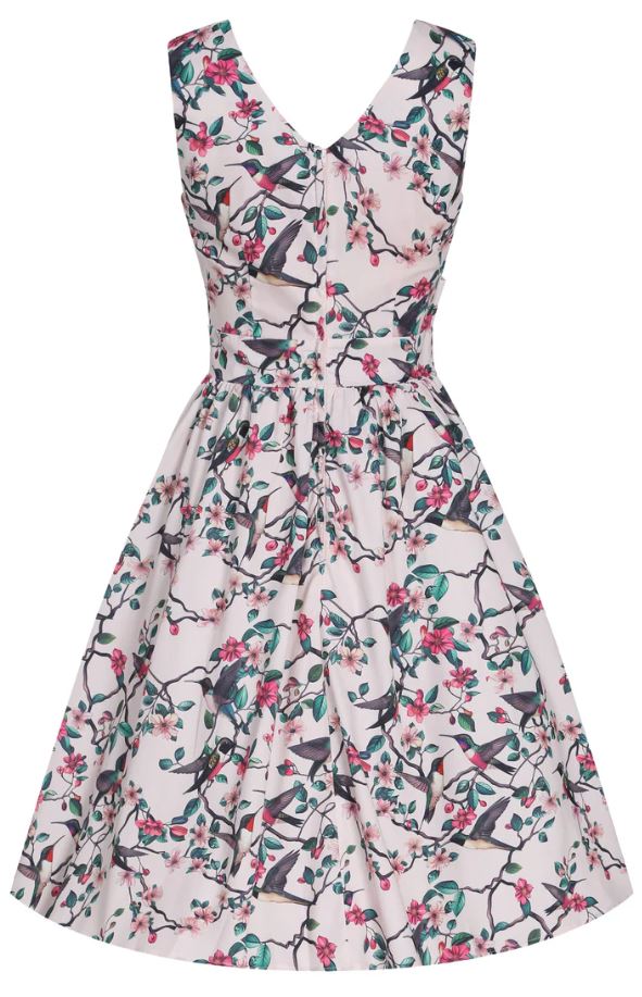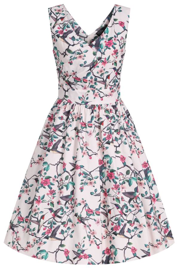 Virágmintás swingruha a Dolly&Dotty-tól, testhezálló derékpánt, klasszikus pin-up mintával,   alapszín: törtfehér. Anyaga: 87% pamut, 3% elasztán, mosási javaslat: 30-40C között. Ajánlott hozzá a V966 cikkszámú bolero.