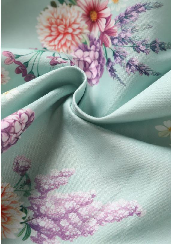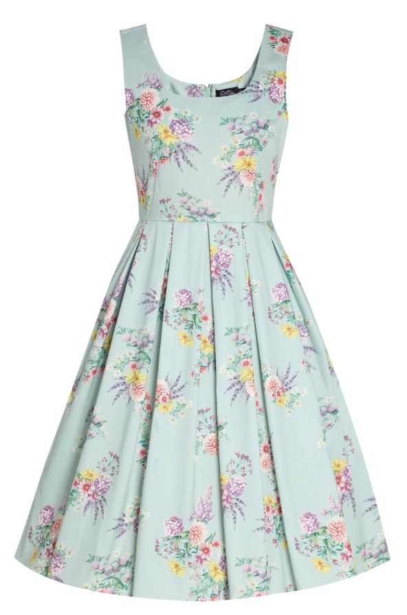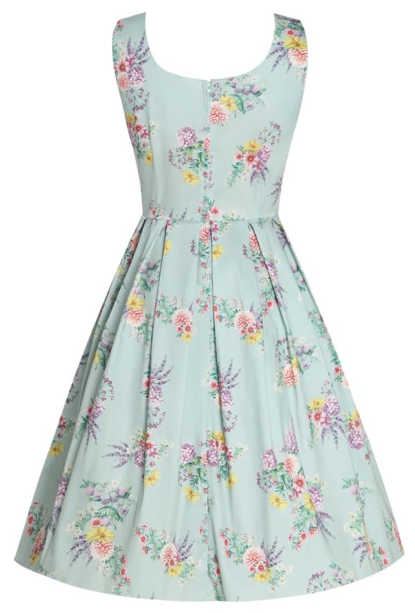 Virágmintás nyári ruha a Dolly&Dotty-tól, testhezálló derékpánt, hátsó rejtett cipzár, két oldalsó rejtett zseb,  alapszín: menta. Anyaga: 87% pamut, 3% elasztán, mosási javaslat: 30-40C között.