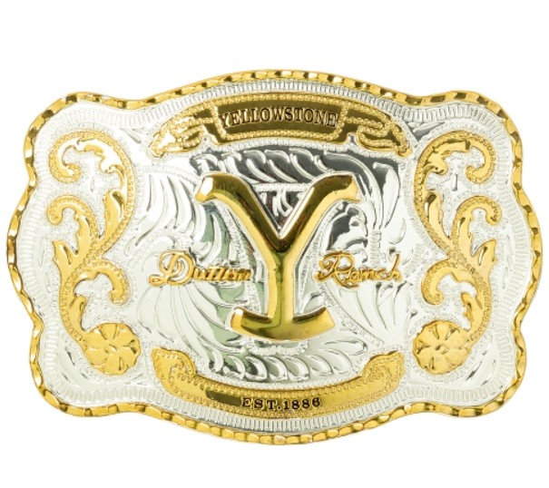 Western övcsat díszes metszéssel, közepén arany applikációval Yellowstone felirat, virágos díszítéssel.